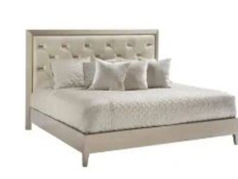 Esta elegante cama destaca por el detalle tapizado del cabecero. Tiene placas decorativas de bronce que añaden sofisticación.