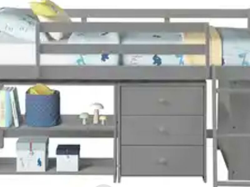 La cama alta Casanova de AjerCe es ideal para maximizar el espacio en habitaciones pequeñas. Incluye una cajonera integrada y dos repiseros en tono gris que ofrecen almacenamiento adicional y exhibición para libros o decoraciones. Fabricada en madera sólida con acabado resistente, combina funcionalidad con un diseño moderno y versátil.