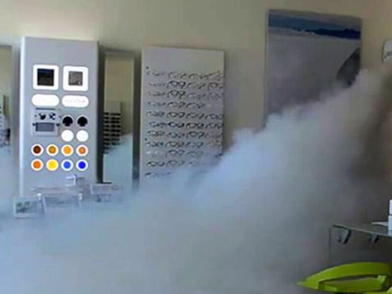 Sistema de seguridad capaz de saturar en pocos segundos el medio en que esta instalado, lanzando en el ambiente una densa niebla que hace la visibilidad nula. La niebla que libera el dispositivo impide totalmente la visual de los ladrones o intrusos, dificultando cualquier posibilidad de robo o acto vandálico.
