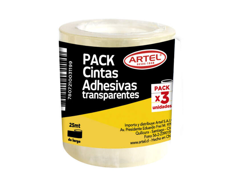 Set 3 cintas adhesivas transparentes. Ancho: 18mm. Largo: 25 metros. Gran elasticidad. Repelente al agua.