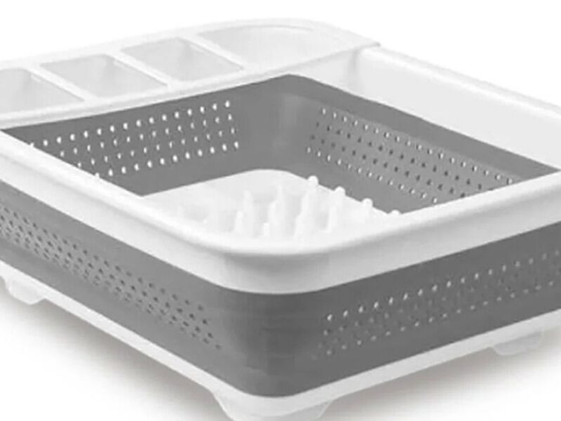 El secaplatos plegable Madesmart® almacena y organiza platos y cristalería a medida que se secan después del lavado con un compartimento separado para cubiertos, aparatos y utensilios de cocina.