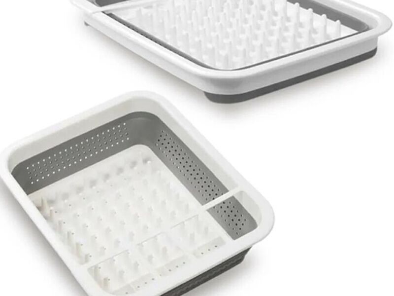 El material flexible permite que el estante para platos se pliegue plano para ahorrar espacio y aprovechar al máximo la encimera o fregadero de su cocina. Se puede usar con un tapete de secado o una tabla de drenaje.