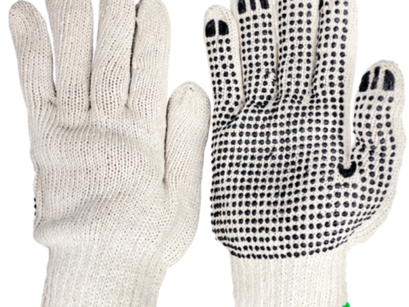 Guante de hilo pigmentado tipo japonés de algodón de 60 gr. con inyección de puntos de PVC en palma y puño estándar tipo calcetín. Indicado para uso general, manipular herramientas manuales, controles, carga, limpieza y actividades sin riesgo mecánico.