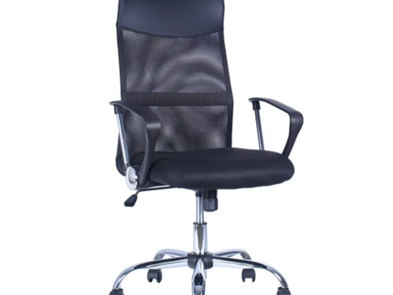 Silla ejecutiva con mecanismo de reclinación simple y tension de inclinación regulable mediante perilla. Respaldo en malla Nylon con memoria elástica, soporte lumbar fijo. Brazos fijos en polipropileno. Asiento tapizado en tela sintética , espuma interior en poluretano inyectado. Regulación de altura de asiento mediante piston a gas. Base estrella 5 puntas en acero cromado con ruedas Nylon de 50mm.
