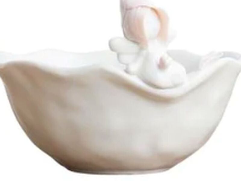 Este delicado bowl está hecho de fina porcelana. Está con nuestro especial ángel recostado encima. Es de color blanco con detalles rosados. Pertenece a nuestra serie ángel té de rosas.