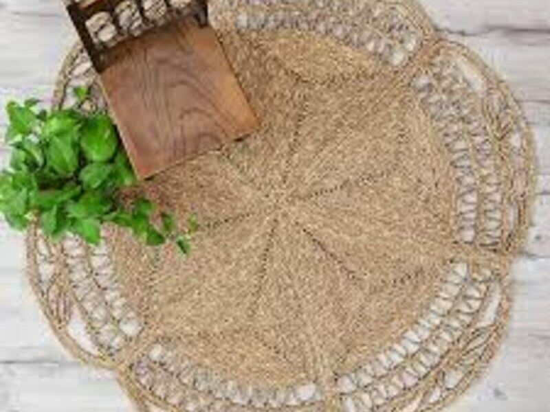 Hermosa Alfombra Redonda de Hierba Marina hecha a mano, tejido plano trenzado y patrón floral.