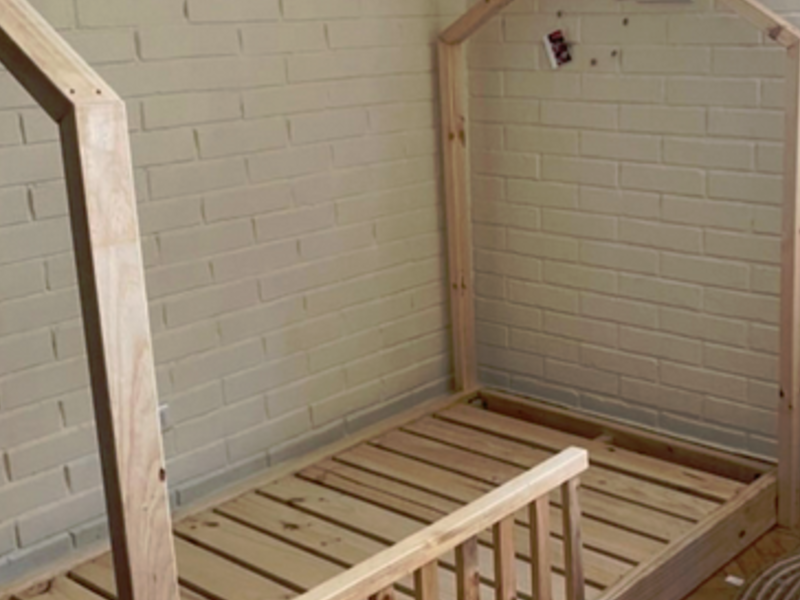 Cama pequeña elaborada en madera de roble, de tamaño que se acomoda en espacios pequeños.