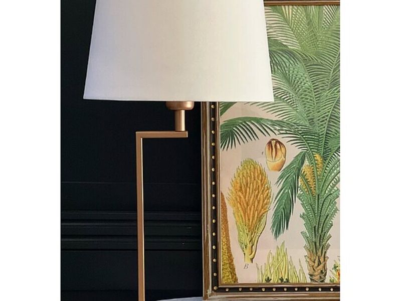 Lámpara de sobremesa en fierro pintado en electro, diseño Cigué en tonos dorados y pantalla semi cónica blanca. Perfecta para laterales en living o para velador.