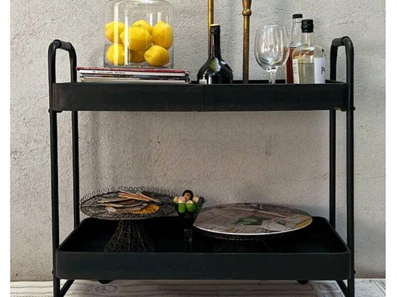 Carro bar de metal en dos niveles, color negro opaco con dejos envejecido. Tiene 4 ruedas para un fácil manejo. Un mueble que hoy no deja de ser un básico.