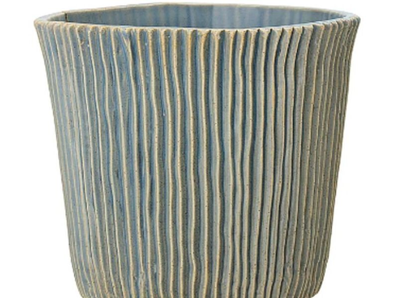Macetero de cerámica gres en tono celeste, con relieves. Este macetero aporta belleza y encanto a tus plantas, junto con aportar un estilo particular a tus espacios.
