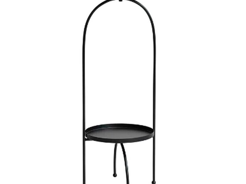 Mesa auxiliar de metal negro, con forma circular y 2 pisos. Esta mesa es ideal para utilizar como mesa lateral o como soporte para plantas.