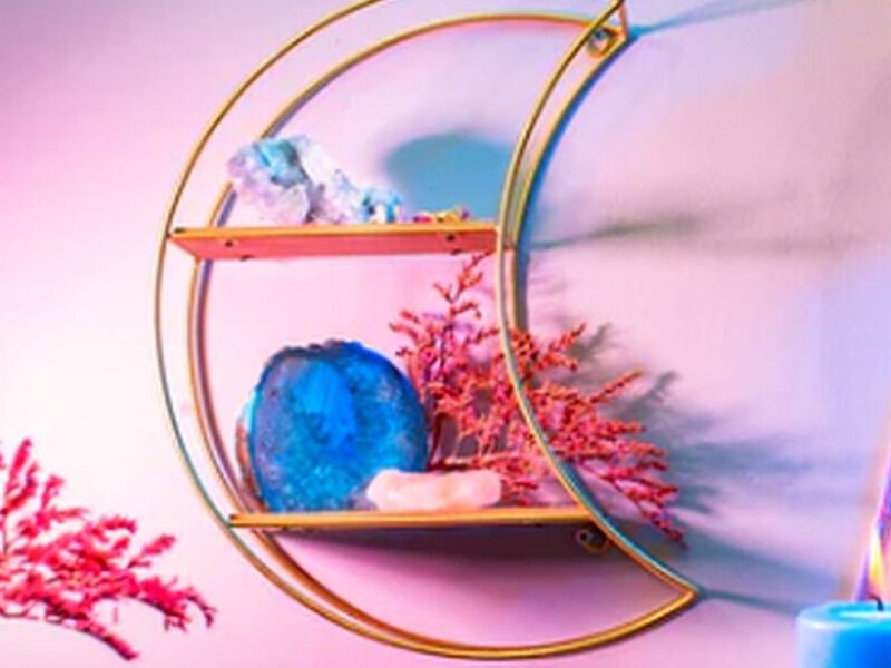 Esta repisa dorada tiene la forma de una luna minimalista con dos tableros para apoyar cosas. Tiene dos prácticos agujeros de gancho para colgar en la pared.