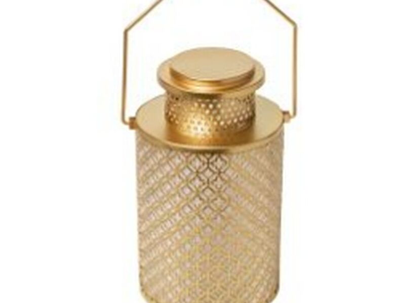 Farol Metálico Dorado. Dimensiones: Alto 26 cm. X Diámetro 15 cm. Función: Baterías doble AA.