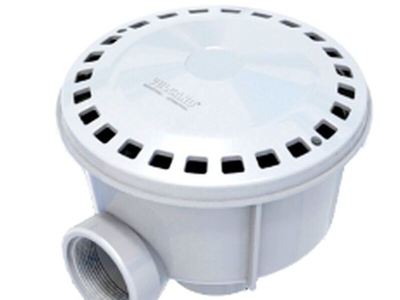 Toma de fondo Vulcano para piscinas de hormigón, con tapa segura de aberturas pequeñas y sistema antiremolino, sujeta con tornillos parker. Fabricadas en poliestireno de alto impacto, cuenta con 2 tomas de rosca hembra de 2″. Ofrece una excelente acción de succión y drenaje, y destaca principalmente por su seguridad y versatilidad.