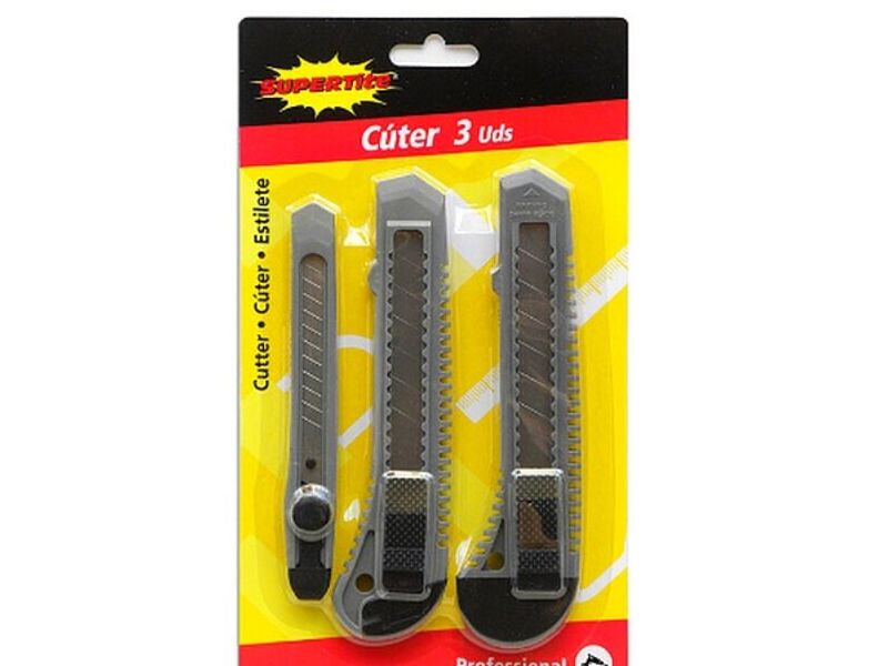 Set de 3 cúter de plástico con diseño ergonómico y hojas de acero inoxidable pre-cortadas.