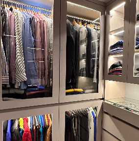 Clóset empotrado con varias estanterías y espacio para colgar ropa, ideal para dormitorios.