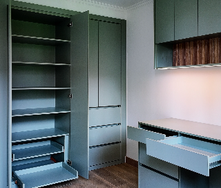 Clóset modular con cajones y estanterías, ideal para maximizar el almacenamiento en habitaciones.