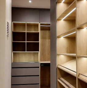 Vestidor amplio con iluminación LED y múltiples estantes para ropa y zapatos.