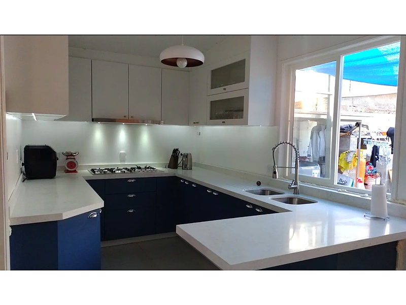 diseño elegante que combina armarios superiores blancos con bases azul oscuro, ofreciendo un estilo contemporáneo y funcional. Su encimera de alta calidad y grifería de último modelo garantizan durabilidad y confort. Ideal para quienes buscan un espacio acogedor y luminoso para cocinar y compartir momentos especiales.
