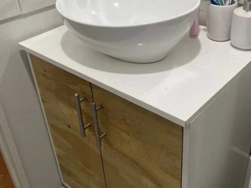 El mueble puede incluir cajones o puertas que están integrados en la estructura de MDF y terciado. Estos proporcionan espacio para almacenar artículos de baño, como toallas, productos de belleza o productos de limpieza.