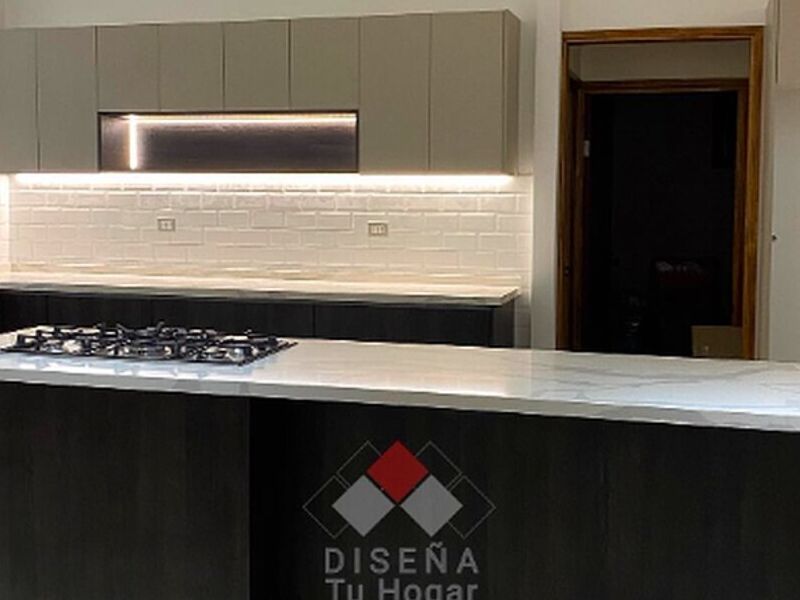 Diseño de cocina completamente equipado, que incluye muebles, electrodomésticos y accesorios, todos integrados de manera armónica.