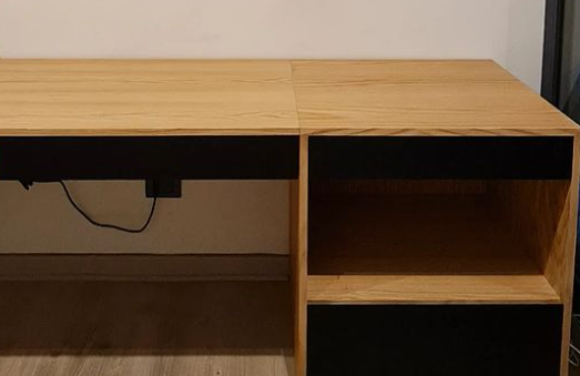 Escritorio de madera y estructura metálica, ideal para desayunadores.