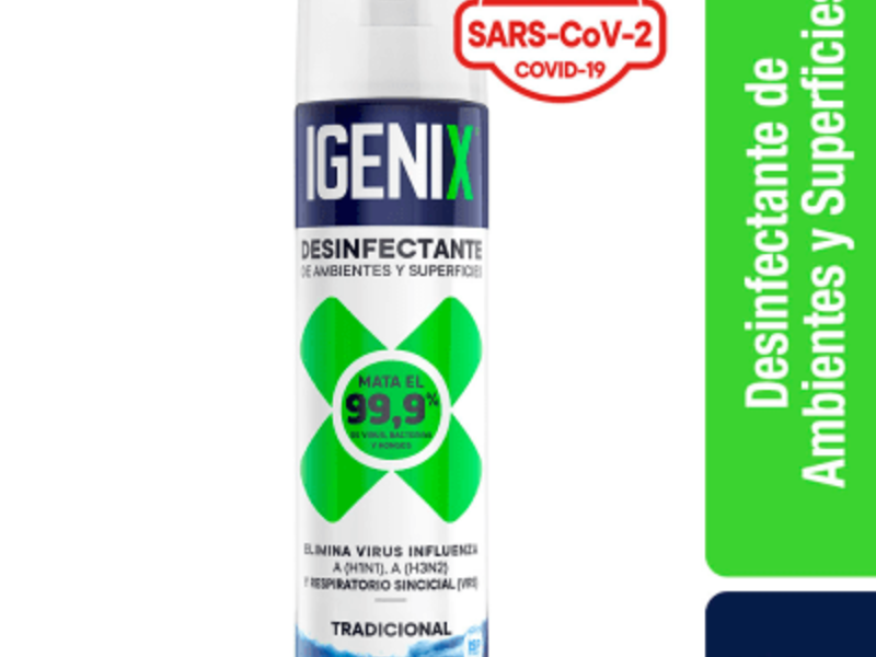 IGENIX Desinfectante de Ambiente y Superficie Aerosol MATA EL 99,9% GÉRMENES, BACTERIAS Y HONGOS EN EL AIRE Y EN SUPERFICIES. Su hogar permanecerá libre de gérmenes que pueden afectar su salud y la de su familia. Su gran poder de desinfección mata: