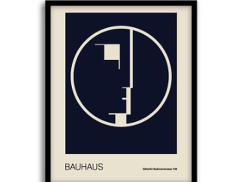 El cartel es una impresión en blanco y negro del logotipo de la Bauhaus. El logotipo es un círculo blanco sobre un cuadrado negro. El círculo está dividido en tres secciones por dos líneas negras que se cruzan en el centro. Las secciones están coloreadas de rojo, amarillo y azul. El cuadrado negro está bordeado por una línea blanca.