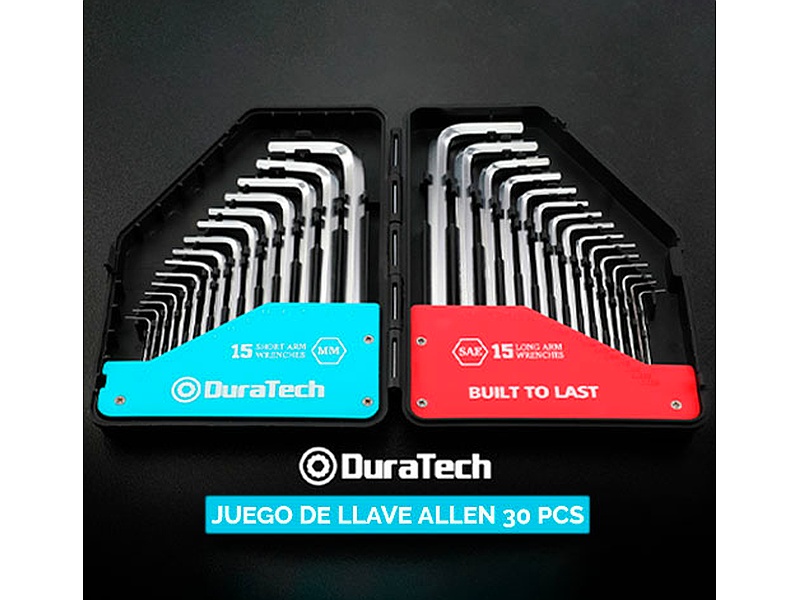 SET DE LLAVES ALLEN DE ACERO CROMO VANADIO CON DUREZA DE HRC 50-57 (alta dureza escala rockwell) , RESISTENTES A LA CORROSIÓN EN ESTUCHE medidas milimétricas desde 0,7 mm hasta los 10 mm y en pulgadas desde 0,028″ hasta 3/8″.