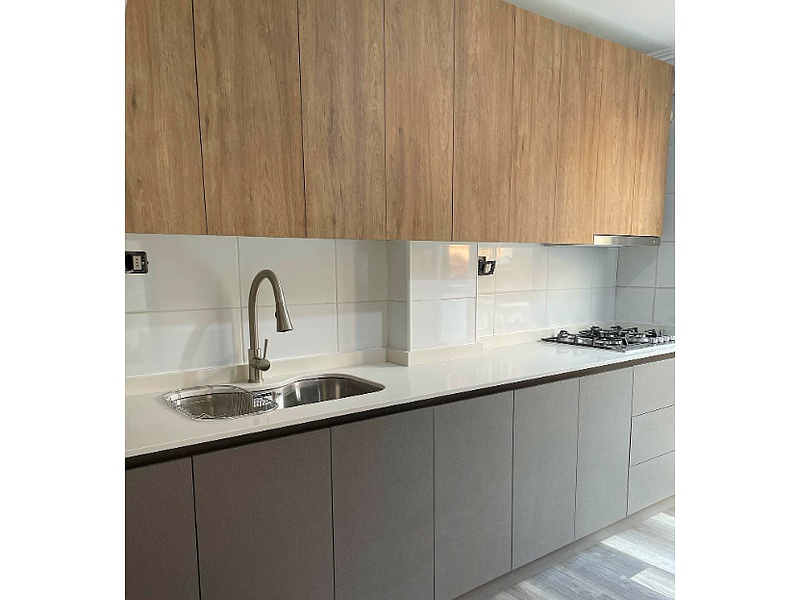Nuestra cubierta de cuarzo beige para muebles de cocina en colores café y gris aporta un toque de calidez y sofisticación a su espacio. Fabricada con materiales de alta calidad, esta cubierta es resistente a manchas y fácil de limpiar, ideal para el uso diario. La combinación de tonos cálidos con los muebles de cocina crea un ambiente acogedor y moderno, perfecto para disfrutar de momentos en familia.