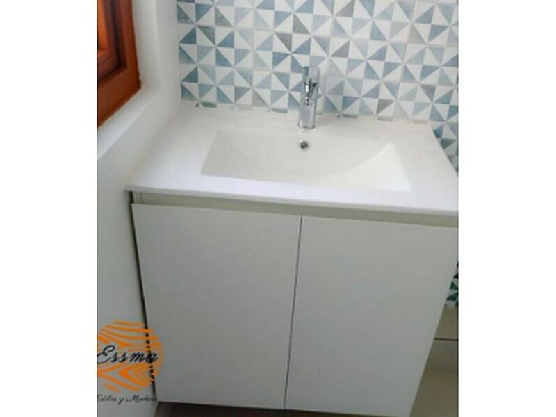 Mueble de baño flotante con lavamanos y espacios en la parte inferior.
