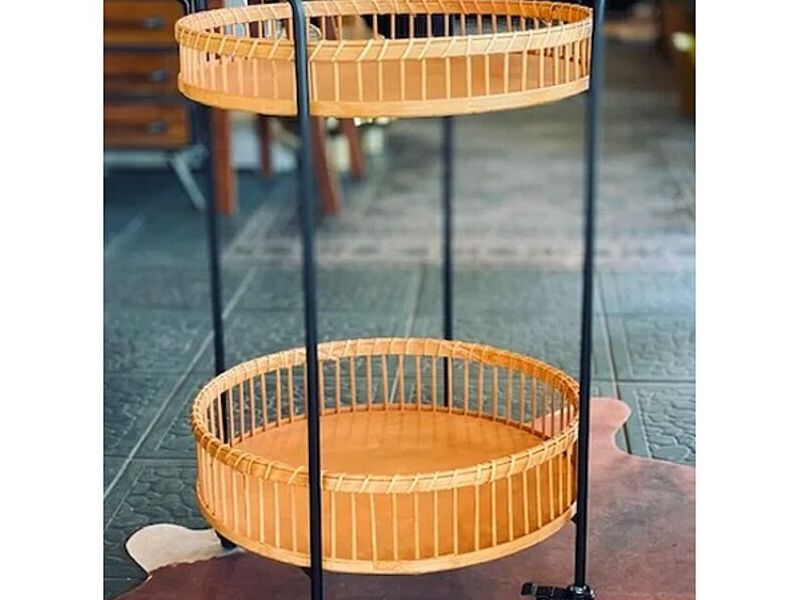 Carro bar de estructura metálica con 2 bandejas de madera y borde de fibra natural.