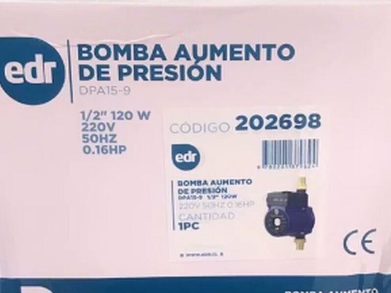 La Bomba Aumento de Presión DPAIS 9 de EDR es ideal para mejorar el suministro de agua en tu hogar. Con potencia de 120W y voltaje de 220V, proporciona presión adicional a calefones, duchas y más. Su diseño robusto garantiza eficiencia y durabilidad.