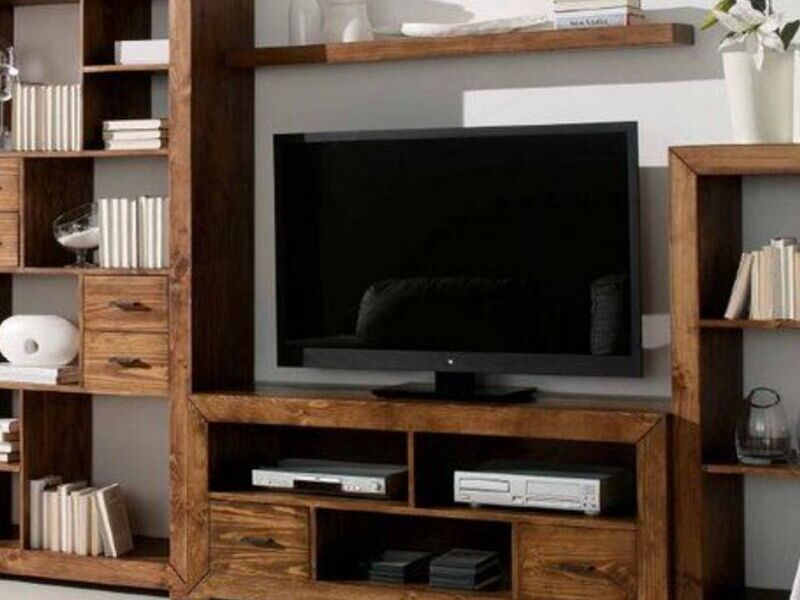 Una mesa de TV de madera es un mueble generalmente más simple y compacto diseñado para sostener la televisión y posiblemente algunos dispositivos multimedia, como reproductores de DVD o consolas de videojuegos. Por lo general, no incluye tanto espacio de almacenamiento como un centro de entretenimiento más grande y se centra en brindar un soporte estable para la televisión, a menudo con uno o dos estantes inferiores para componentes adicionales.