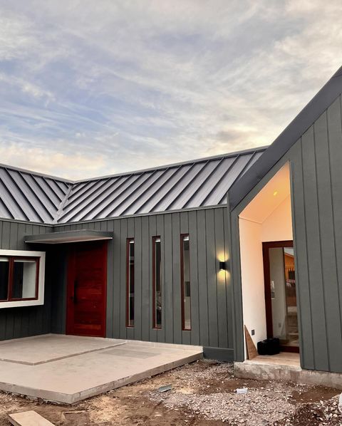 Fachada moderna con revestimiento en tonos oscuros, destacando la entrada principal con detalles en madera cálida.
