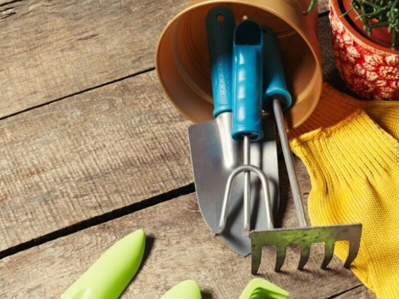 Herramientas de jardinería manual. Palas, rastrillos, podadoras de setos y otros utensilios para el cuidado y mantenimiento de jardines y áreas verdes.