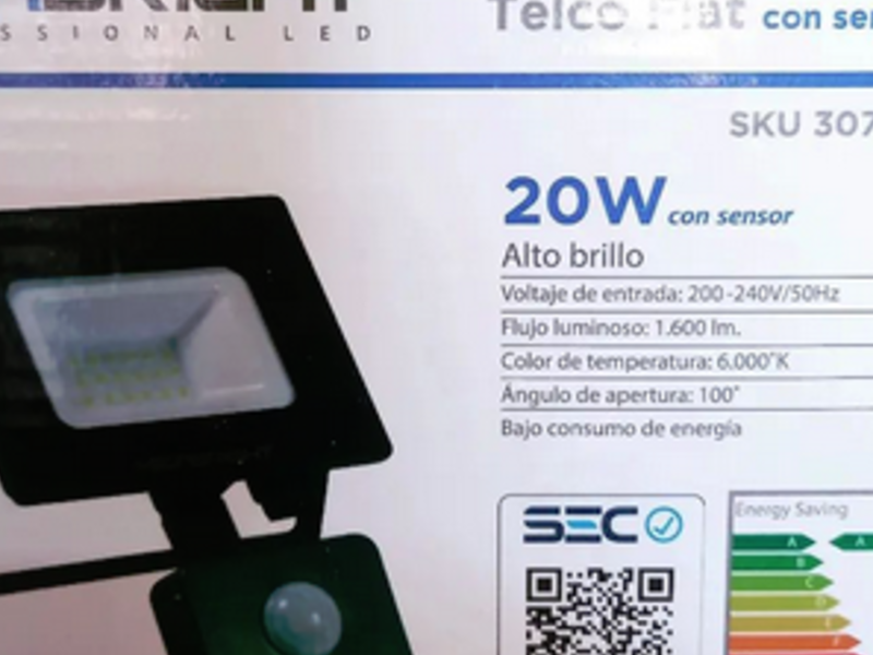 Foco proyector de uso exterior, cuenta con sensor de movimiento, 20W de alto brillo, ángulo de apertura de 100°, 70% ahorro de energía.