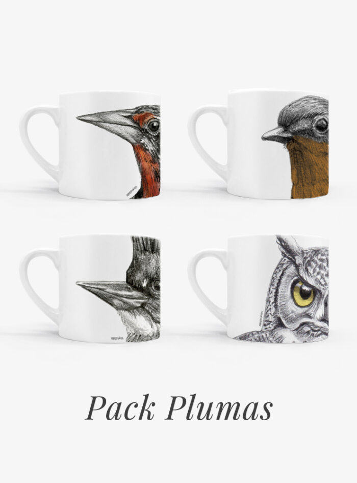 Si encuentras que tu café de la mañana es indispensable para sobrevivir, imagina lo aún más importante que es la naturaleza! Ella es quien permite que pueda existir tu café de la mañana. 4 tazas con ilustraciones de especies de nuestro país: loica, chucao, martín pescador, tucúquere