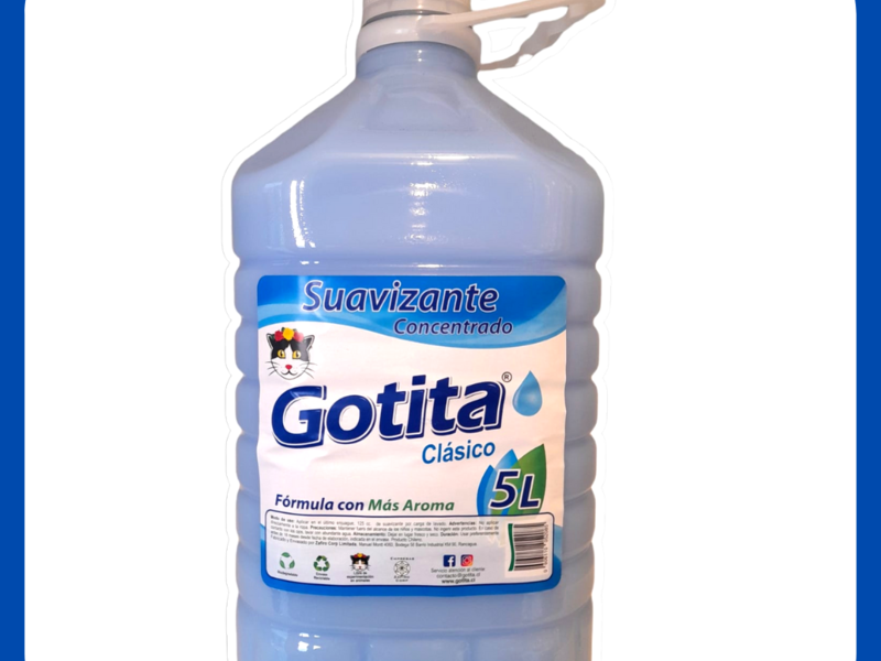 El Suavizante Gotita Clásico es un suavizante de ropa líquido de color azul claro que viene en una botella de plástico de 5 litros. Está hecho con una fórmula biodegradable que es suave con la ropa y la piel. El suavizante Gotita Clásico ayuda a eliminar la estática, reduce las arrugas y deja la ropa con un aroma fresco y duradero.