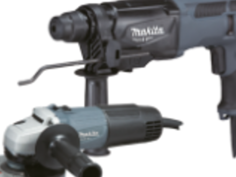 Kit versátil que incluye un mini esmeril y martillo rotativo, proporcionando herramientas esenciales para trabajos de precisión y acabado en diversos materiales.