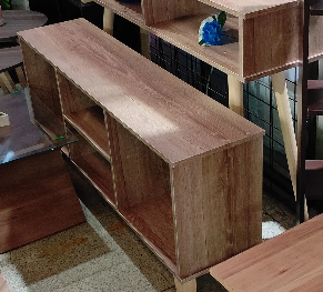 Estante de madera maciza con acabado rústico para salas o recibidores.
