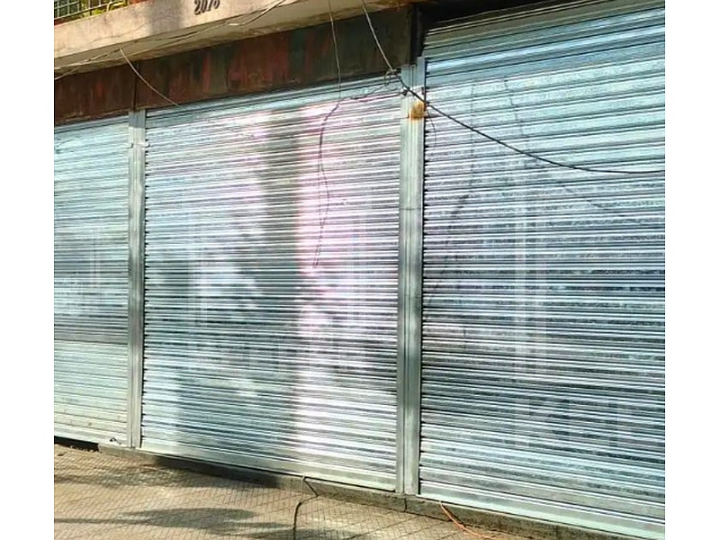 Cortina metálica con paneles acrílicos para visualización interna, ideal para negocios.