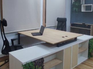 Un escritorio con estantes en la parte superior proporcionando espacio adicional para organización Ideal para oficinas o estudios