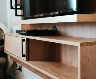 Un soporte para televisión hecho de madera clara con espacio de almacenamiento inferior Ideal para organizar dispositivos electrónicos