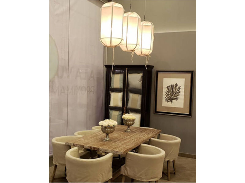 Lámpara de fierro con funda de lino/algodón. Perfecta para comedores con gran altura y terrazas.