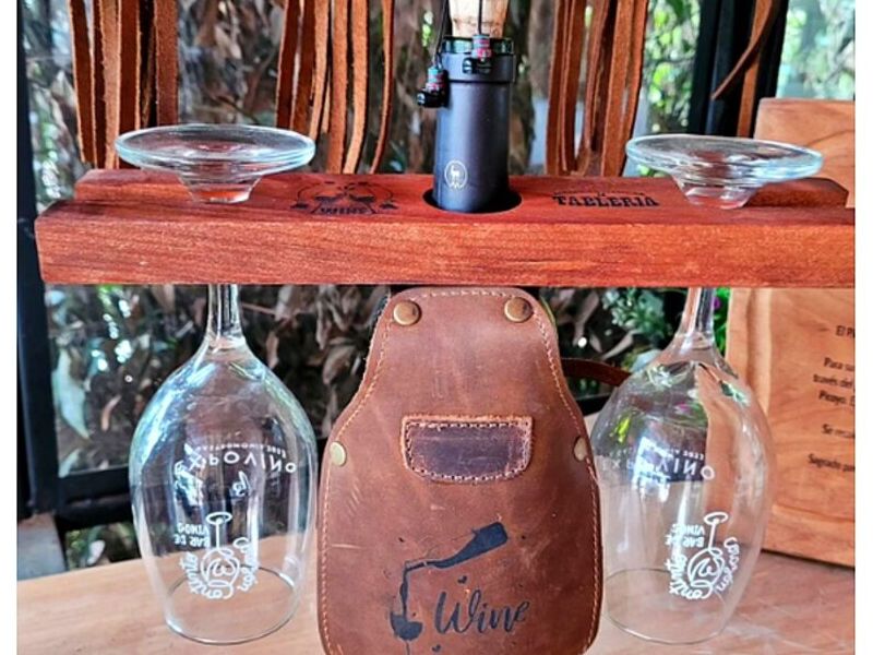 PECHERITA DE CUERO PERSONALIZADA + PORTACOPAS DE MADERA PARA BOTELLA DE VINO PERSONALIZADO.