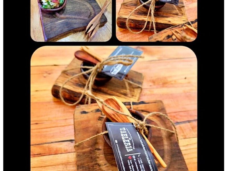 tabla individual de roble , coigue, rauli 20x10 cms app ( pueden variar las medidas) + 2 pinchos y 1 cuchara de rauli + pocillo de greda para aderezos, pebre, etc..