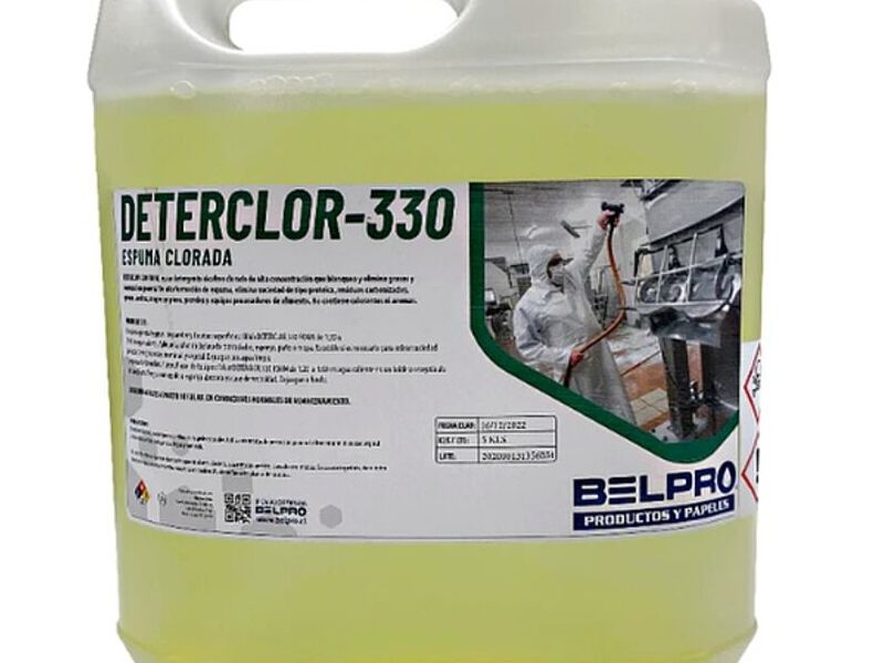 DETERCLOR - 330 FOAM de BELPRO, una espuma clorada potente para la limpieza profunda de pisos, paredes y superficies. Su fórmula alcalina elimina grasa, suciedad proteica y manchas difíciles, sin dejar aromas ni residuos. Ideal para uso en entornos alimentarios y comerciales.
