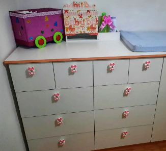 Cómoda blanca con cajones de diferentes tamaños, perfecta para habitaciones infantiles.