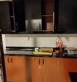 Cocina integral de madera con gabinetes claros, ideal para un ambiente rústico y funcional.